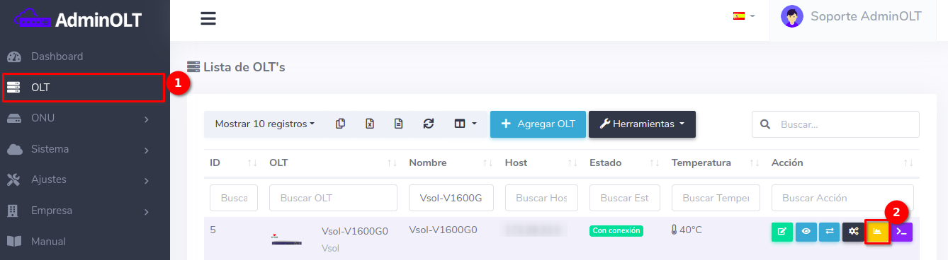 Fecha de liberacion 2 de Agosto de 2022 a las 10:13 Gráficas para OLT y ONU (VSOL/WOLCK GPON)Ahora el sistema de AdminOLT ha habilitado que las marcas de OLT VSOL y WOLCK puedan activar el monitoreo. Con esto se podrán mostrar las gráficas de consumo y estado tanto de la OLT y de la ONU.