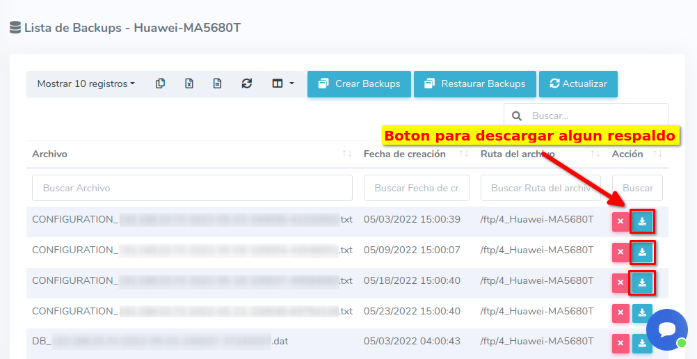 Fecha de liberacion 11 de Octubre de 2022 a las 17:15 Descarga de Backups (HUAWEI y ZTE)Ahora es posible descargar los backups (respaldos) listados en la tabla que está disponible en AdminOLT. Esta opción es única para OLTs marca HUAWEI y ZTE