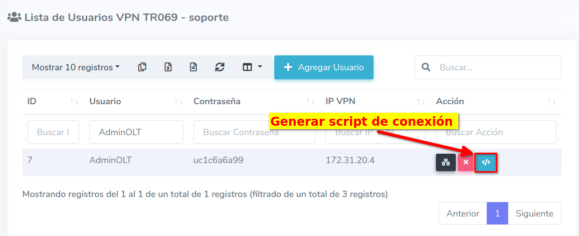 3Una vez guardado nos regresará a la lista de Usuarios VPN TR069 donde podremos ver un mensaje confirmando que se agregó correctamente.
