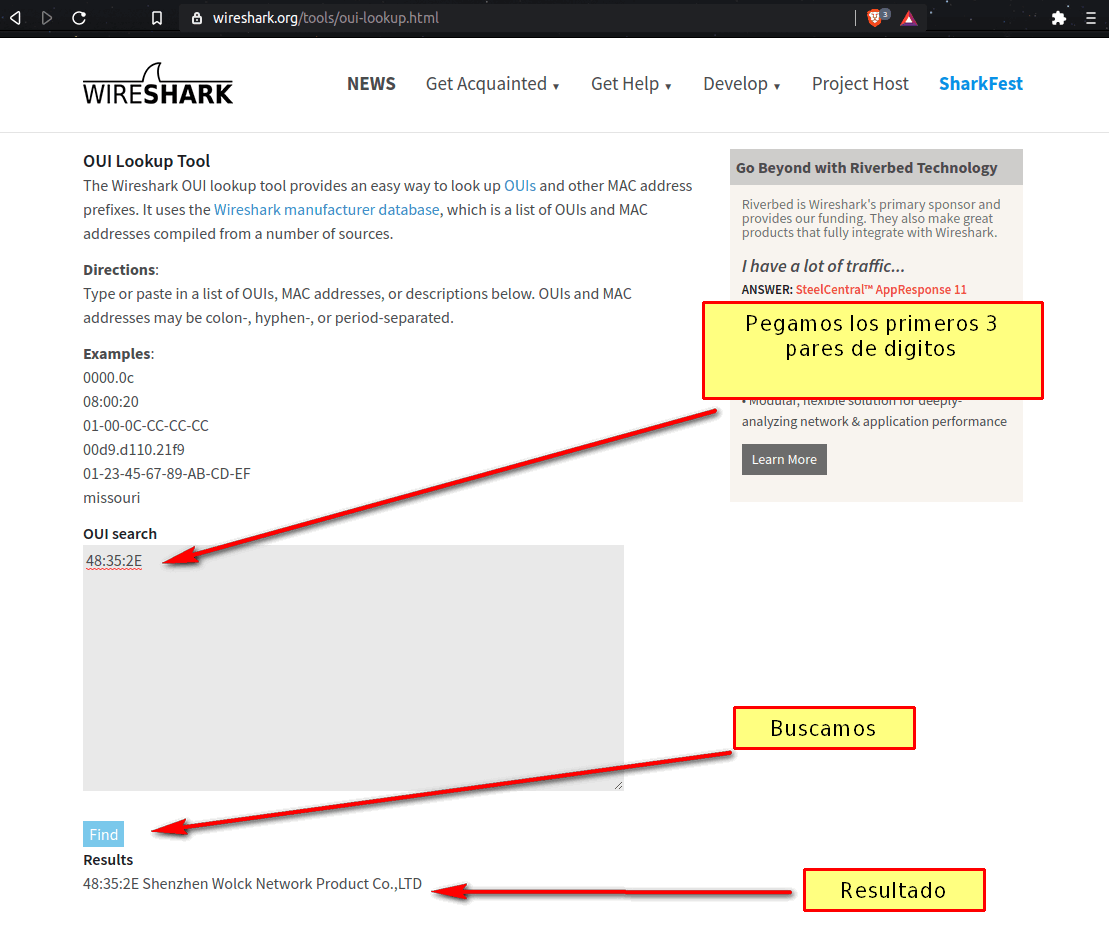 Entramos a la pagina WireShark y buscamos los primeros 3 pares de números de nuestra Mac