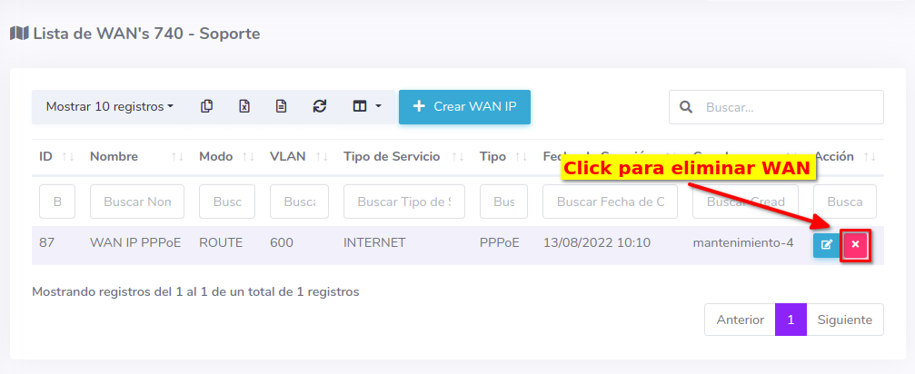 2Seleccione la opción Crear WAN IP y complete el formulario, con este proceso podrá autorizar y crear una WAN IP a una ONU al mismo tiempo.