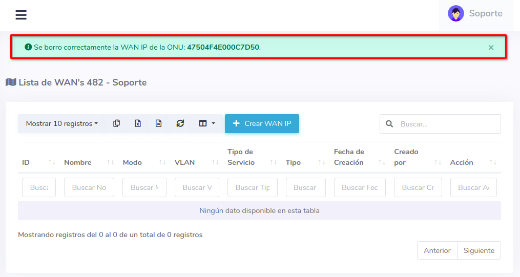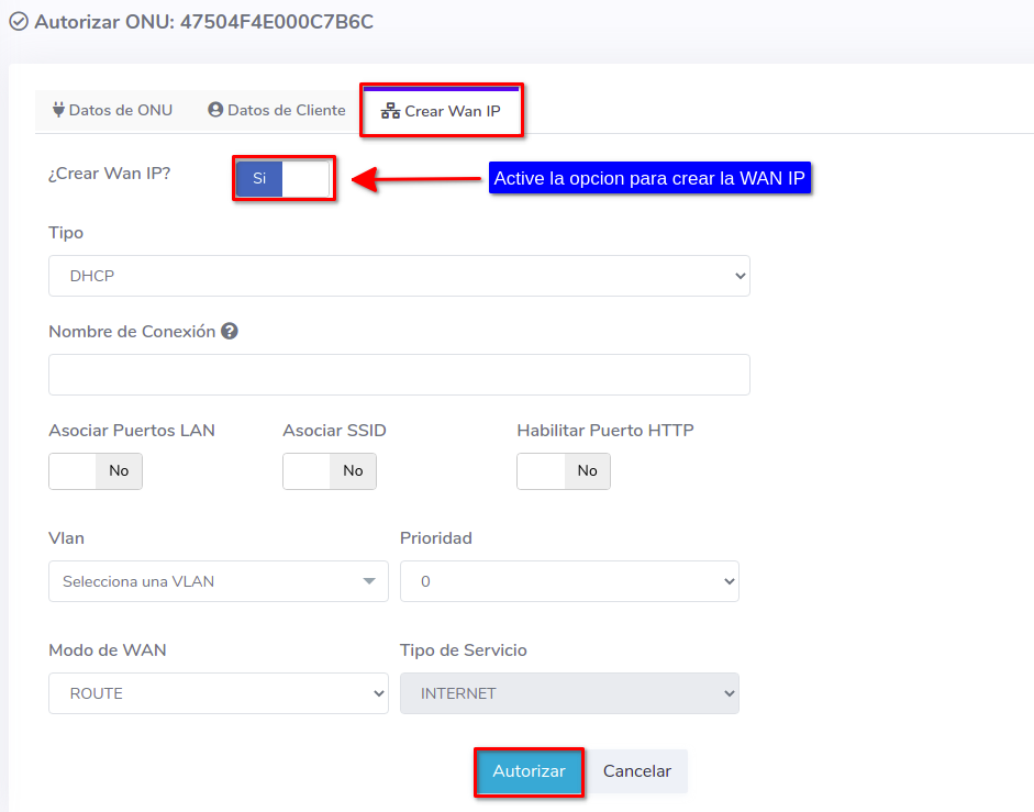 2Seleccione la opción Crear WAN IP y complete el formulario, con este proceso podrá autorizar y crear una WAN IP a una ONU al mismo tiempo.