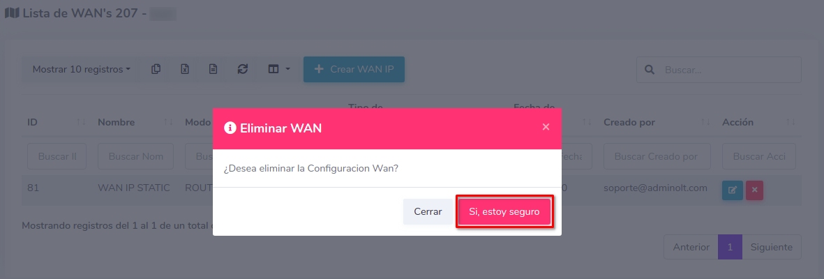 2Seleccione la opción Crear WAN IP y complete el formulario, con este proceso podrá autorizar y crear una WAN IP a una ONU al mismo tiempo.