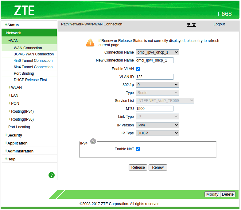 Al entrar a la interfaz de la ONU podremos ver que la configuración WAN se ha creado.