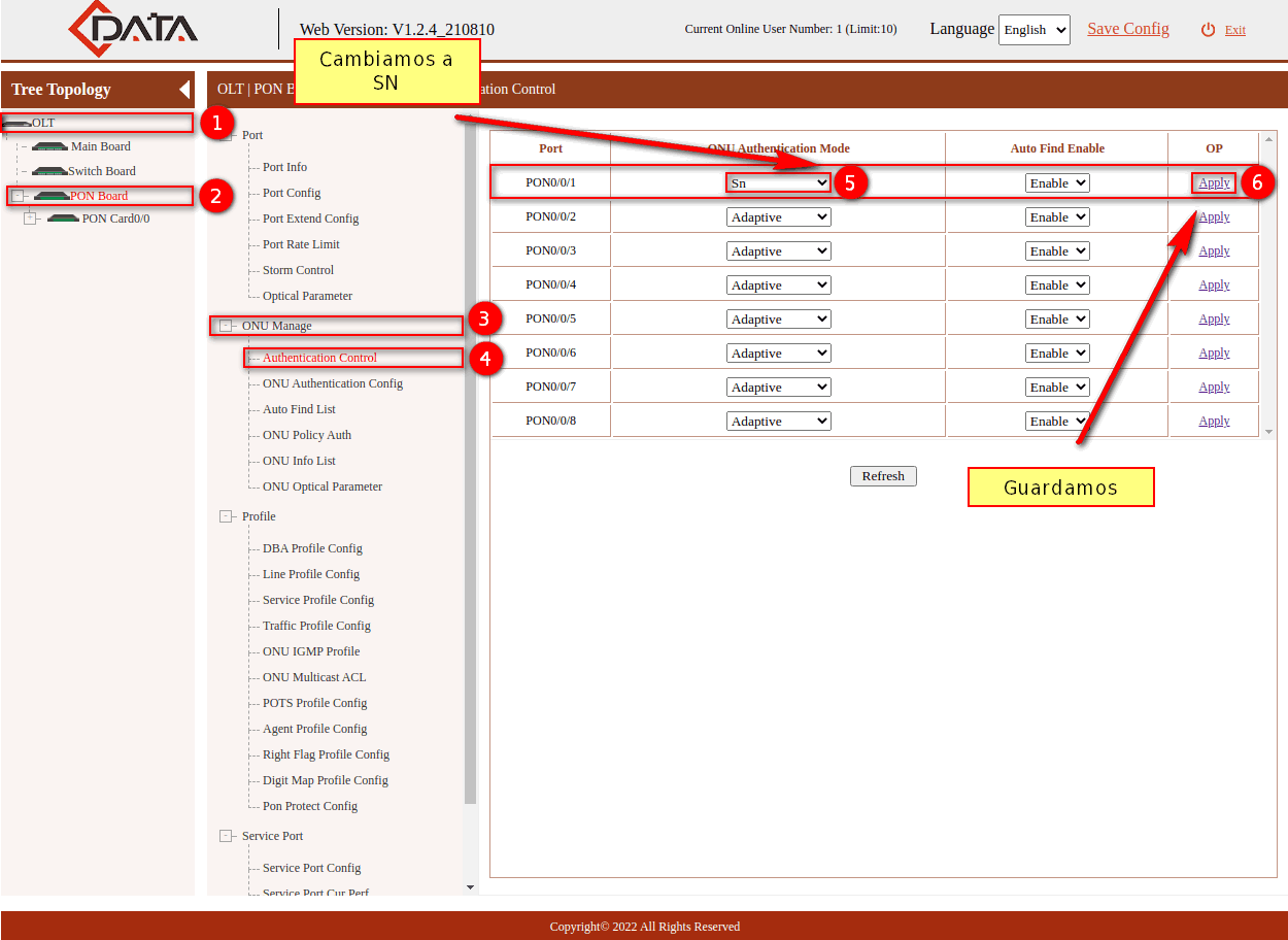 1 Entramos a la interfaz web de nuestra OLT e iniciamos sesión y deshabilitamos el modo Auto o Adaptive