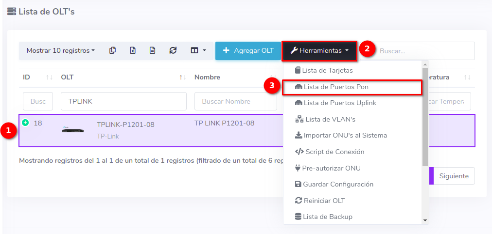 1 Ir a Lista de Puertos PON de nuestra OLT