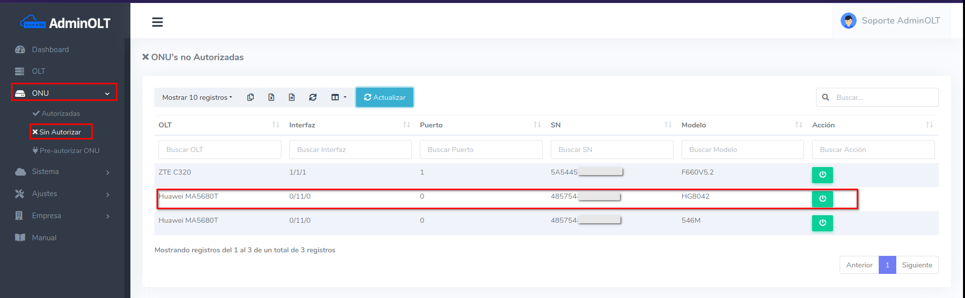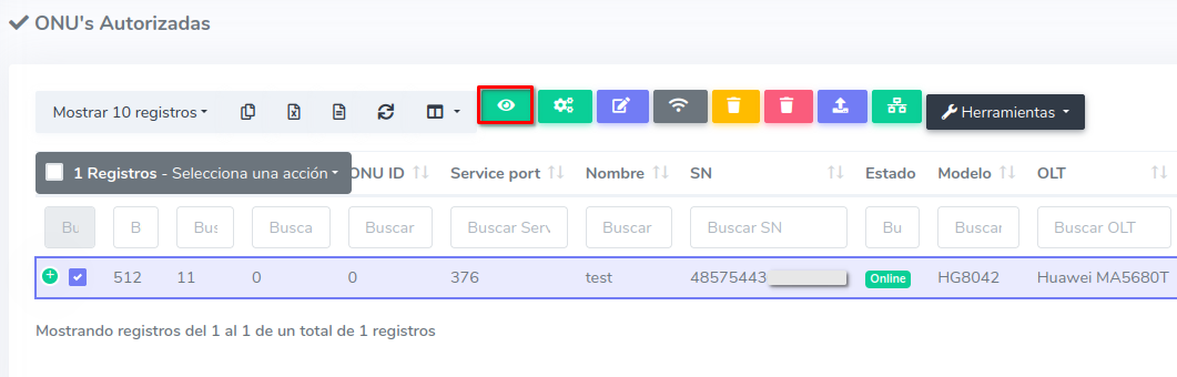 1Dirijase a la sección de ONU > Autorizadas y seleccione la ONU con la que desea trabajar.
