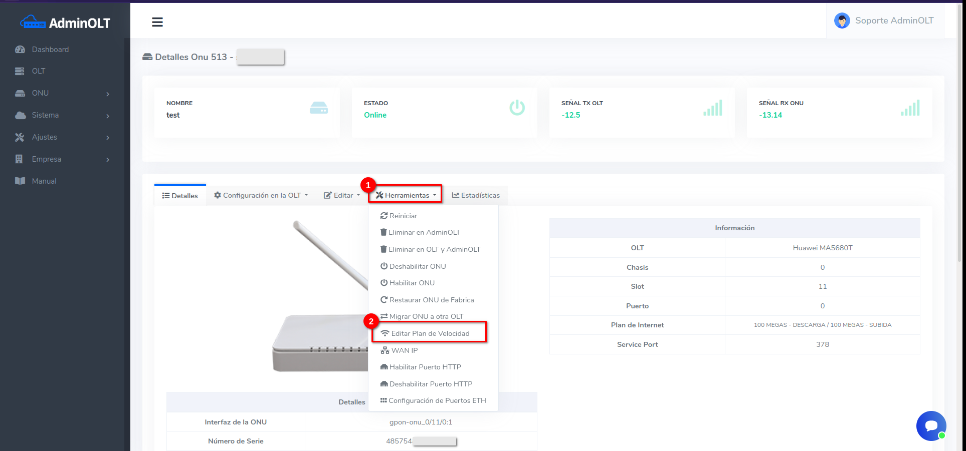 1Dirijase a la sección de ONU > Autorizadas > Editar Plan de Velocidad