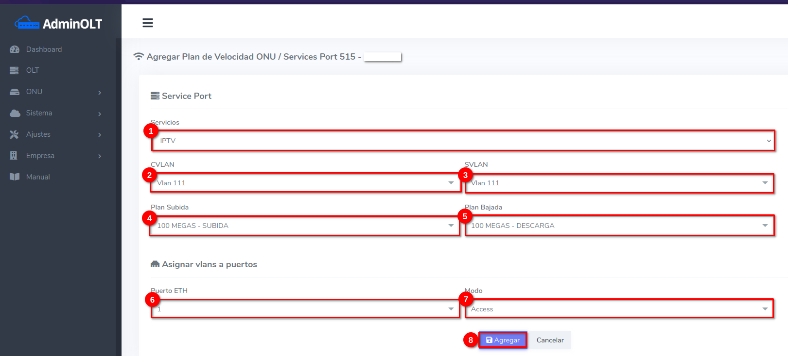 4 Seleccione un Servicio, seleccione un plan de subida, de bajada, el puerto a donde ira dirigida esa vlan y en que modo.