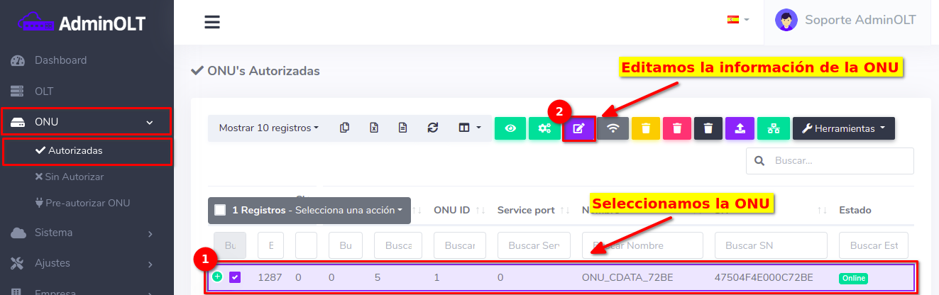 En AdminOLT podemos editar información de una ONU Autorizada en la OLT, supongamos que alguna de las ONUs que tenemos autorizadas en el sistema se estropea. Tomaremos como ejemplo esta situación para explicar el propósito de esta función. Así que en ese caso en AdminOLT al editar ONU por SN podemos tomar información de alguna ONU no Autorizada y usarla, sin perder la configuración inicial que teníamos.