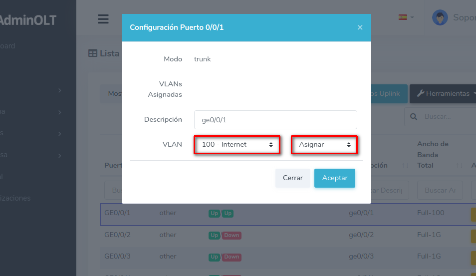 Puede escribir una descripción y escoger entre asignar o remover la VLAN