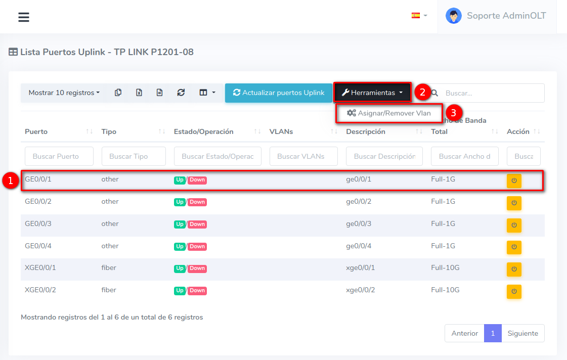 1 En la Lista OLT's seleccionamos el equipo con el que trabajaremos para después ir a Puertos Uplink, que se encuentra en el botón con la leyenda Herramientas.