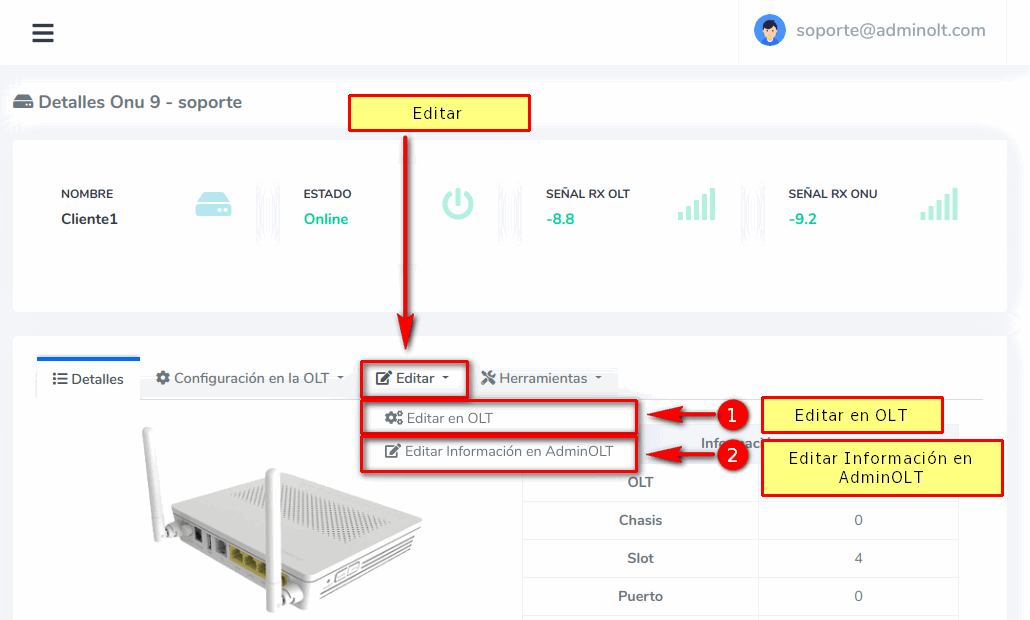 1.-Editar en OLT: Para más información puede leer el apartado Editar ONU en OLT desde Detalles de ONU