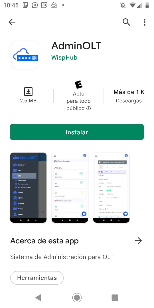 Ingresamos a Play Store y buscamos la app AdminOLT. Pulsaremos en instalar hasta que el proceso de descarga finalice.