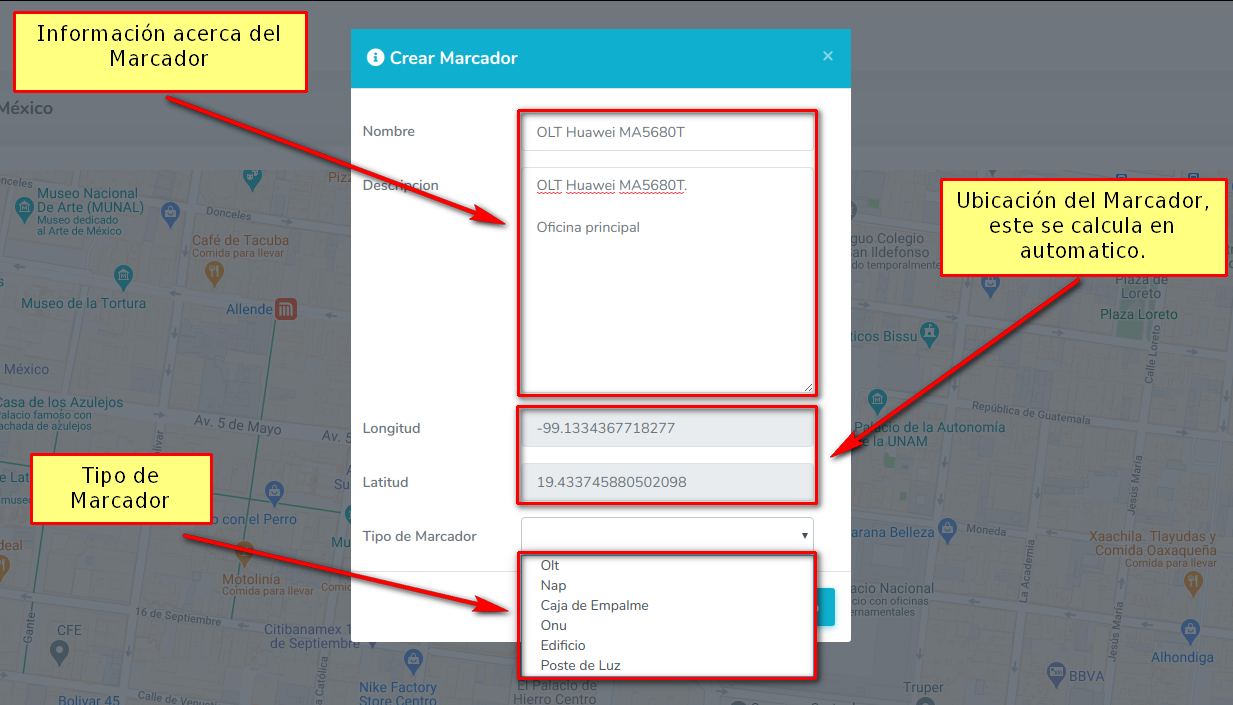 Una vez que llenemos la información, se creara el marcador en el mapa, en este caso se creo un marcador Tipo OLT, por lo tanto se creo un marcador con un icono que hace referencia a una OLT.