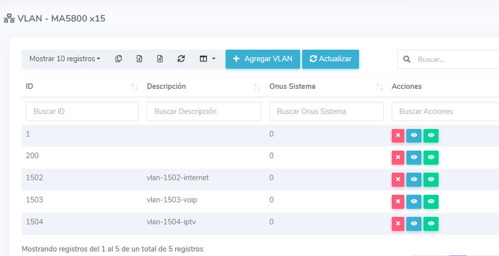 Una vez creadas las VLAN en el router, es necesario que las creemos en la OLT. Nos dirigimos a Lista de OLT, seleccionamos Herramientas y en la opción Lista de VLAN vamos a crear esas mismas VLAN.