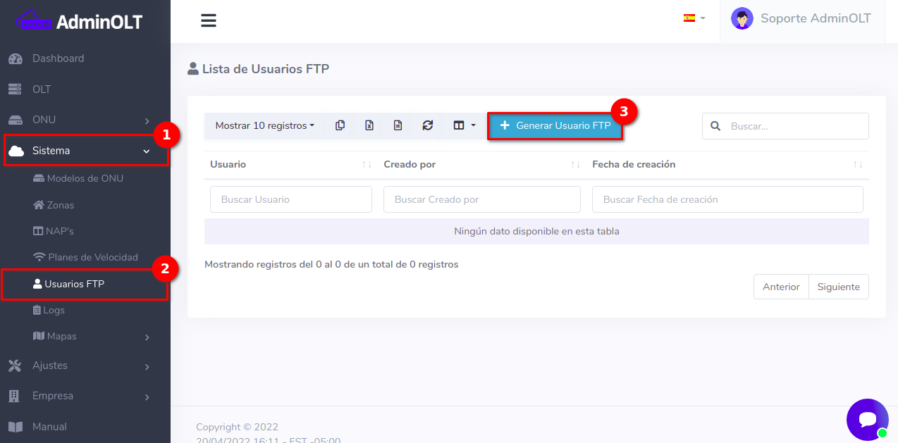Si está interesado en crear respaldos de la información de su OLT, el siguiente manual explica los primeros pasos para empezar con este proceso. El sistema AdminOLT almacenará sus respaldos en un servidor FTP (File Transfer Protocol) para que después el usuario puede consultarlos en cualquier momento, pero para esto es necesario que haya algo que lo identifique en el servidor y para eso debe generar sus accesos correspondientes.
